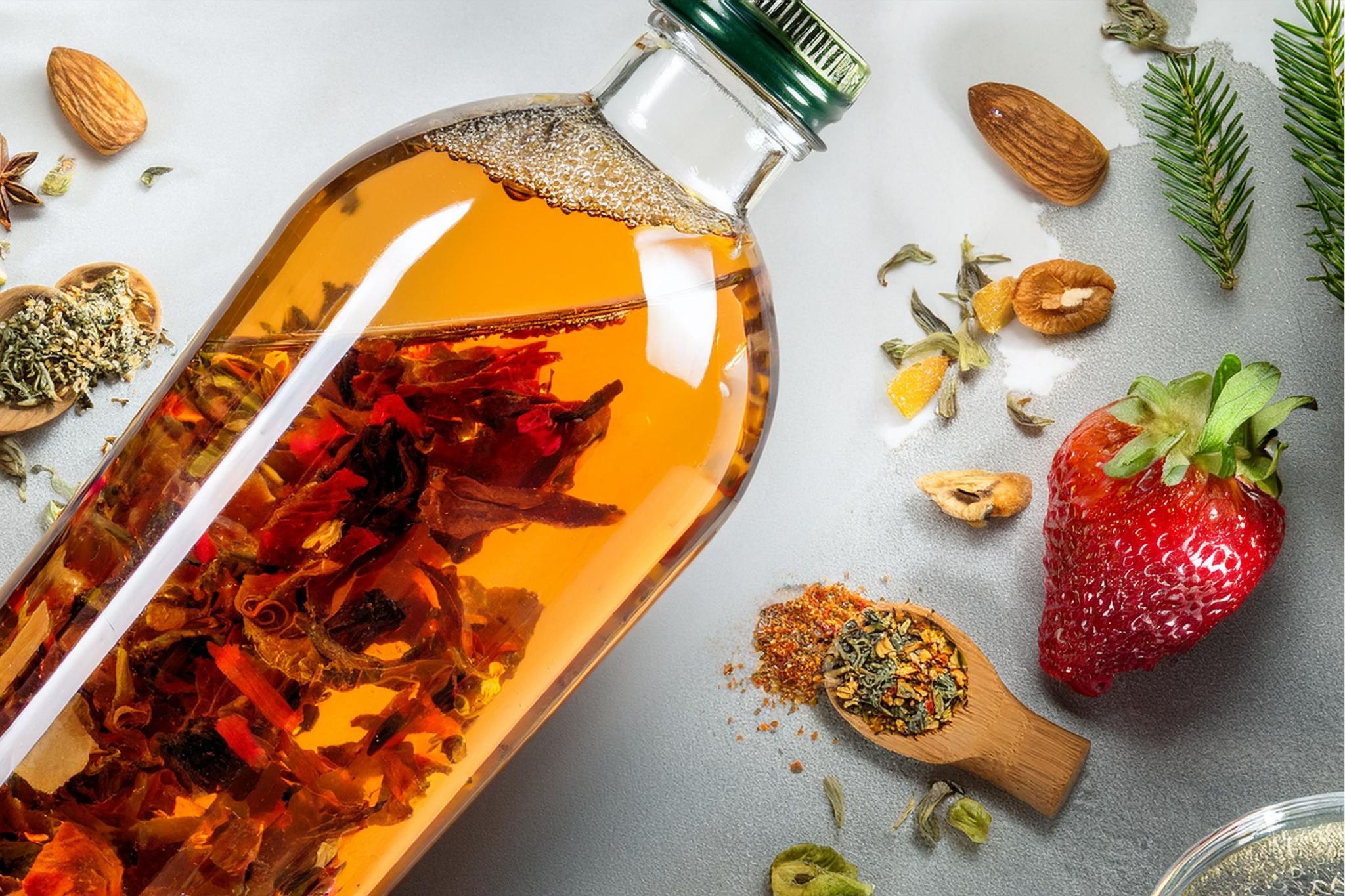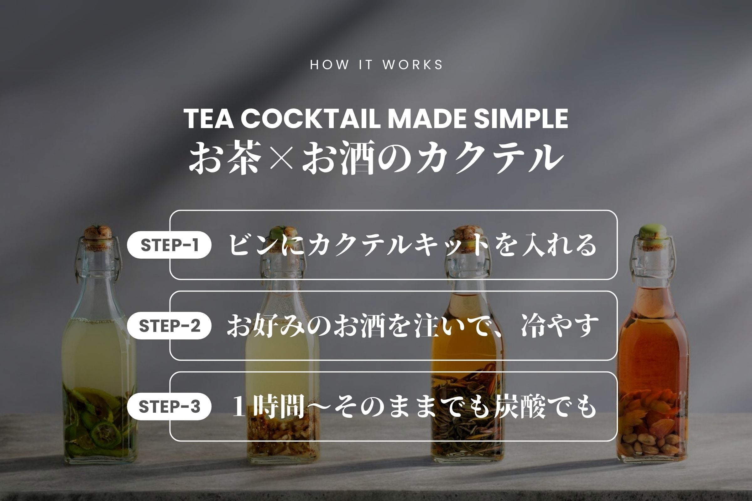 KANPAIカクテルキットは、400mlのお酒でお茶などの具材からカクテルを作ります。40度以上のスピリッツをご使用いただくことで、カテキンやテアニンなどの有効性成分を水やお湯よりも140%以上効率よく溶け込みます。
